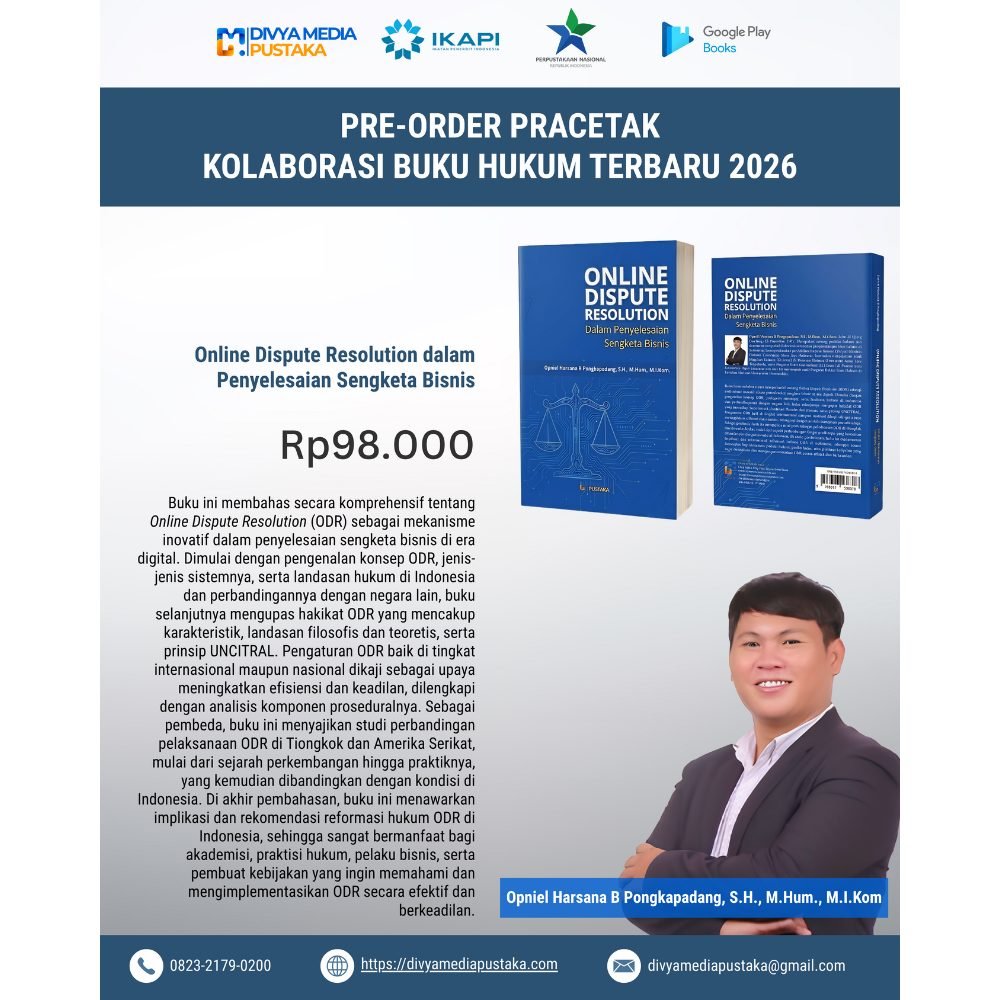Buku ini membahas secara komprehensif tentang Online Dispute Resolution (ODR) sebagai mekanisme inovatif dalam penyelesaian sengketa bisnis di era digital. Dimulai dengan pengenalan konsep ODR, jenis-jenis sistemnya, serta landasan hukum di Indonesia dan perbandingannya dengan negara lain, buku selanjutnya mengupas hakikat ODR yang mencakup karakteristik, landasan filosofis dan teoretis, serta prinsip UNCITRAL. Pengaturan ODR baik di tingkat internasional maupun nasional dikaji sebagai upaya meningkatkan efisiensi dan keadilan, dilengkapi dengan analisis komponen proseduralnya. Sebagai pembeda, buku ini menyajikan studi perbandingan pelaksanaan ODR di Tiongkok dan Amerika Serikat, mulai dari sejarah perkembangan hingga praktiknya, yang kemudian dibandingkan dengan kondisi di Indonesia. Di akhir pembahasan, buku ini menawarkan implikasi dan rekomendasi reformasi hukum ODR di Indonesia, sehingga sangat bermanfaat bagi akademisi, praktisi hukum, pelaku bisnis, serta pembuat kebijakan yang ingin memahami dan mengimplementasikan ODR secara efektif dan berkeadilan.