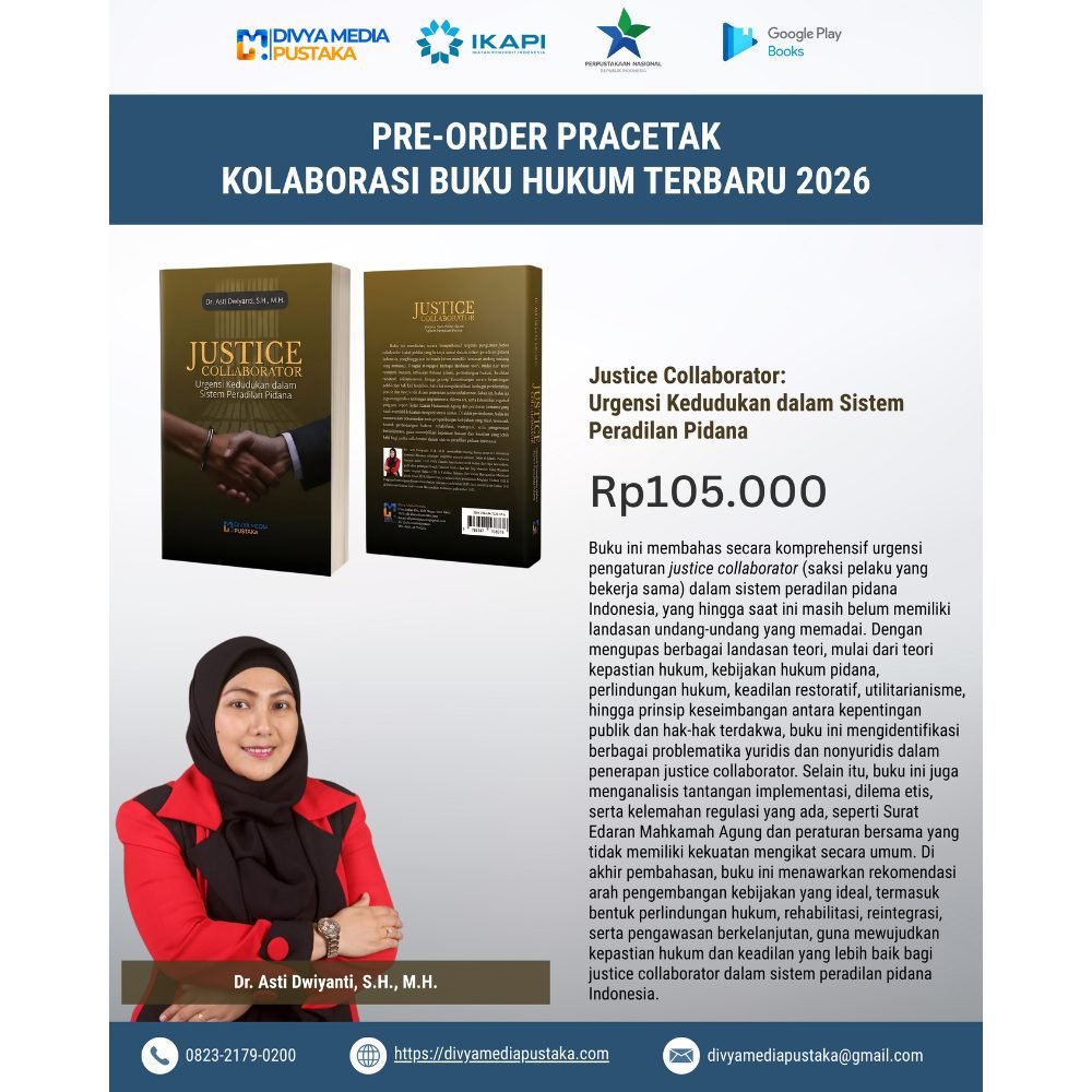 Buku ini membahas secara komprehensif urgensi pengaturan justice collaborator (saksi pelaku yang bekerja sama) dalam sistem peradilan pidana Indonesia, yang hingga saat ini masih belum memiliki landasan undang-undang yang memadai. Dengan mengupas berbagai landasan teori, mulai dari teori kepastian hukum, kebijakan hukum pidana, perlindungan hukum, keadilan restoratif, utilitarianisme, hingga prinsip keseimbangan antara kepentingan publik dan hak-hak terdakwa, buku ini mengidentifikasi berbagai problematika yuridis dan nonyuridis dalam penerapan justice collaborator. Selain itu, buku ini juga menganalisis tantangan implementasi, dilema etis, serta kelemahan regulasi yang ada, seperti Surat Edaran Mahkamah Agung dan peraturan bersama yang tidak memiliki kekuatan mengikat secara umum. Di akhir pembahasan, buku ini menawarkan rekomendasi arah pengembangan kebijakan yang ideal, termasuk bentuk perlindungan hukum, rehabilitasi, reintegrasi, serta pengawasan berkelanjutan, guna mewujudkan kepastian hukum dan keadilan yang lebih baik bagi justice collaborator dalam sistem peradilan pidana Indonesia.